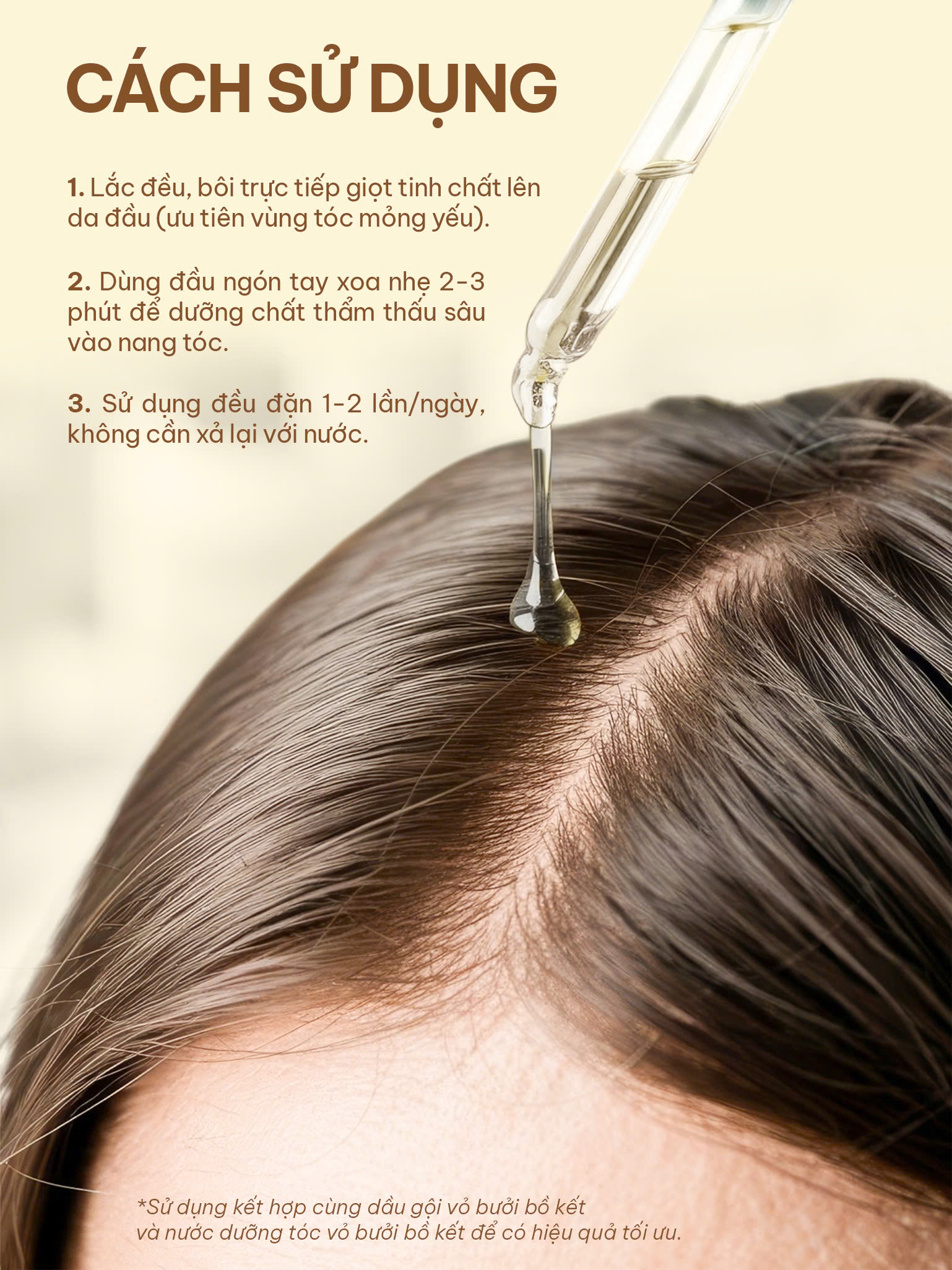 - Giọt: Lắc đều, bôi trực tiếp giọt tinh chất lên da đầu (ưu tiên vùng tóc mỏng yếu).