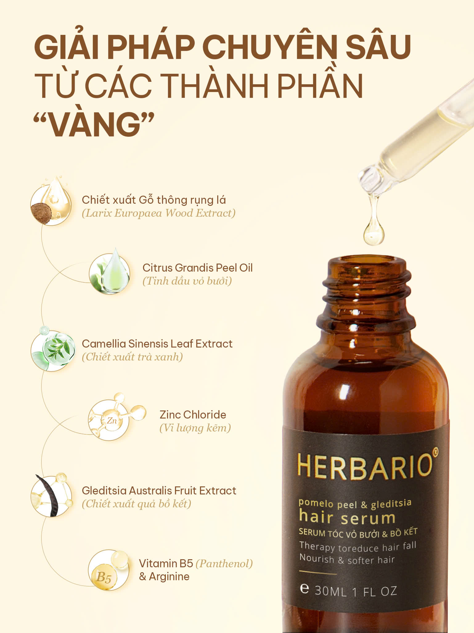 Serum Vỏ Bưởi & Bồ Kết Herbario giảm rụng tóc, giúp tóc mọc nhanh dày khỏe. Công thức thảo mộc kết hợp Vitamin B5, Bạc Hà và Chiết Xuất Thiên Nhiên nuôi dưỡng nang tóc.