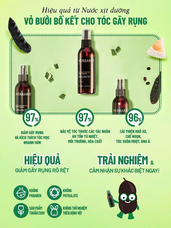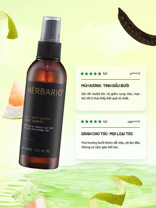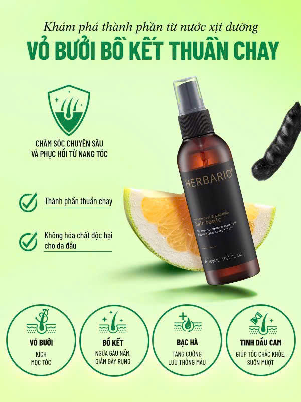 Nước dưỡng tóc tinh dầu vỏ Bưởi và Bồ Kết Herbario GIẢM RỤNG TÓC cung cấp dưỡng chất và độ ẩm cho thân tóc khô thẩm thấu nhanh!